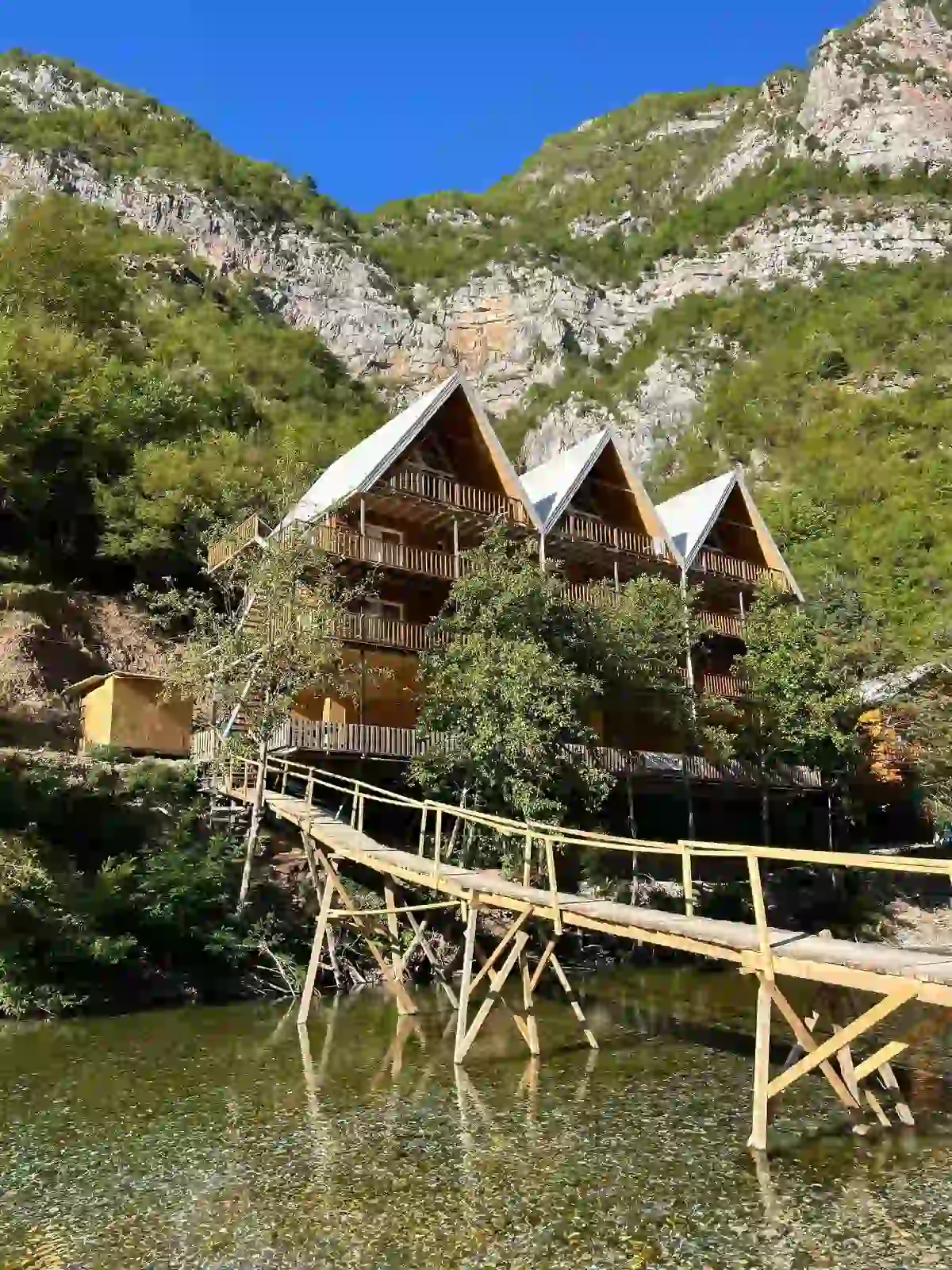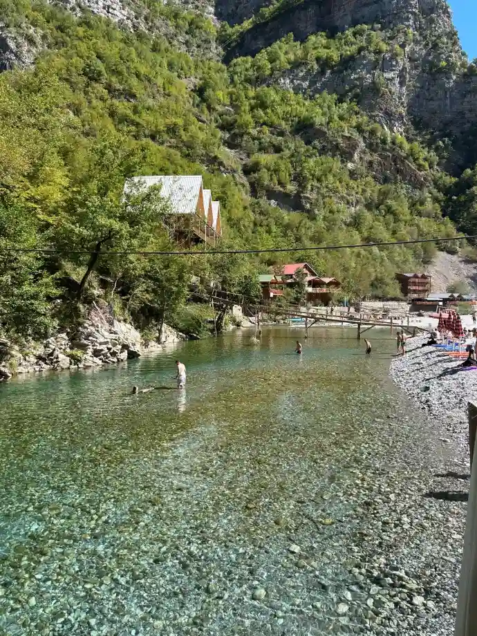 Abbiamo dormito in una zona chiamata Shala River, dove si trova un piccolo insieme di hotel e ostelli completamente isolati dal mondo, sulla riva di un fiume cristallino che scorre tra le montagne. Praticamente un sogno 😅